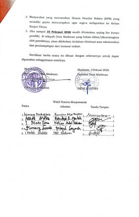 Pada hari Selasa 03 Februari 2026 telah dilaksanakan rapat tentang Penyepakatan Tindak Lanjut Kasus Gigitan Anjing Positif Rabies Di Desa Madenan yang dihadiri oleh Ketua dan Anggota BPD,Kepala Puskesmas Tejakula II,Bhabinsa,Bhabinkamtibnas,Kelian Se-Desa Adat,Petugas Kesehatan ,dan Bidan Desa bertempat di Ruang Rapat Kantor Desa Madenan.